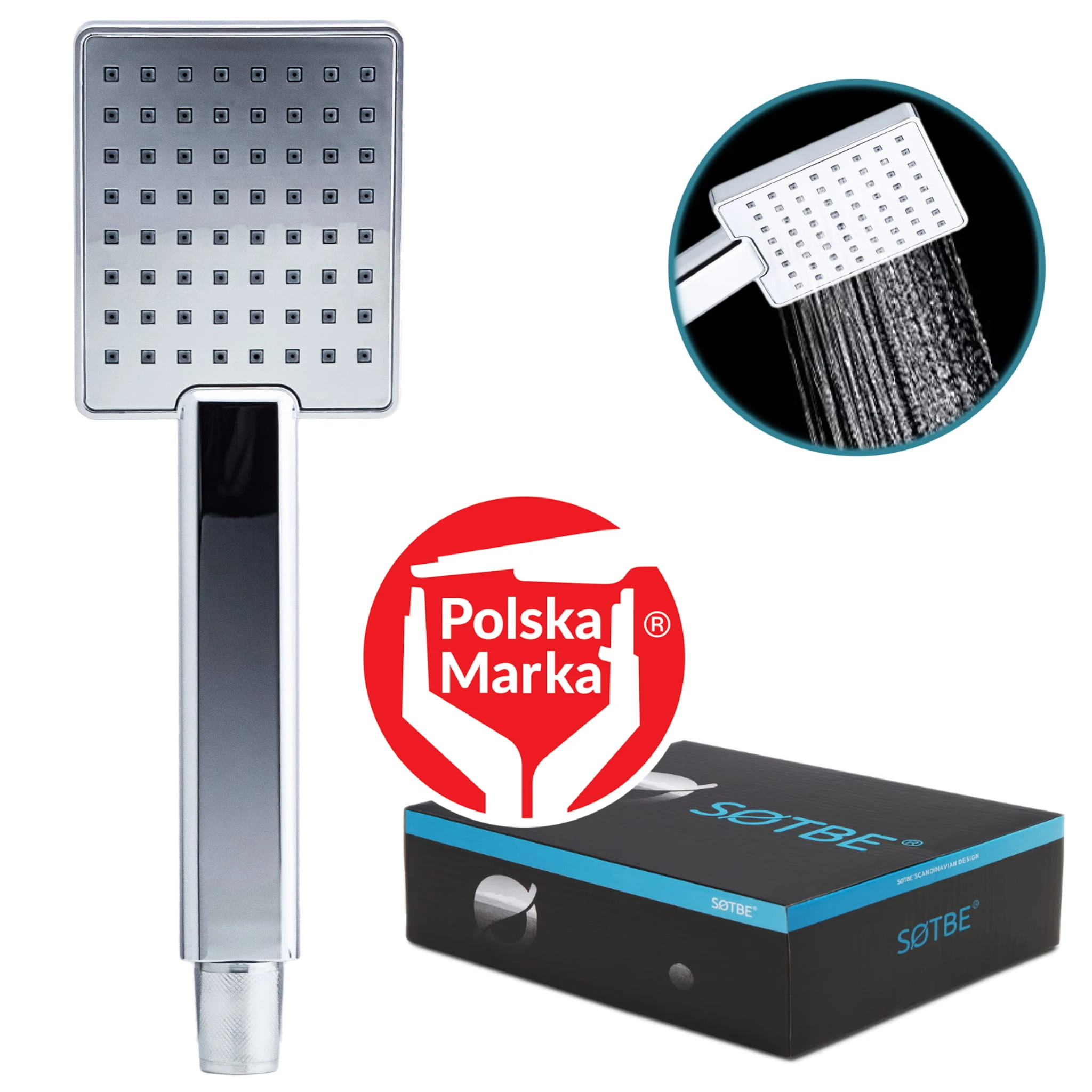 Oferujemy Państwu lekką, bezpieczną dla wanny kwadratową słuchawkę prysznicową 1-zakresową SOTBE QSOHE z systemem ANTI CALC kolor chrom.